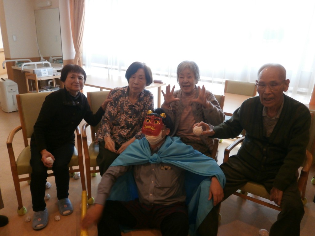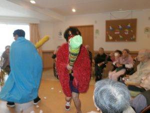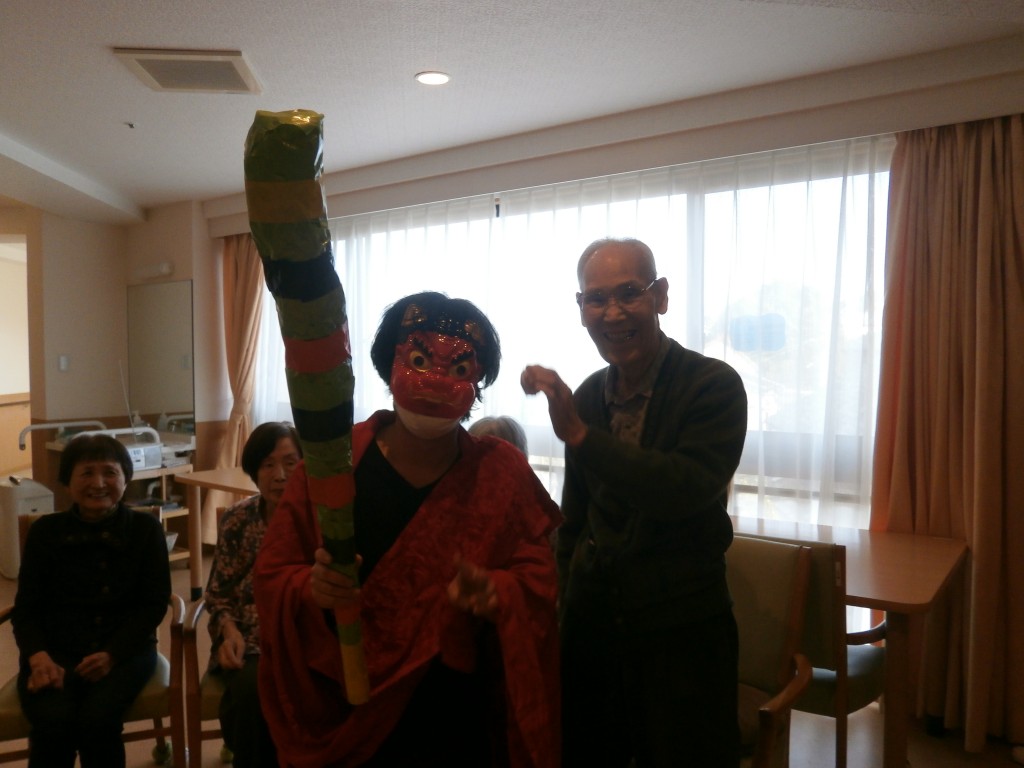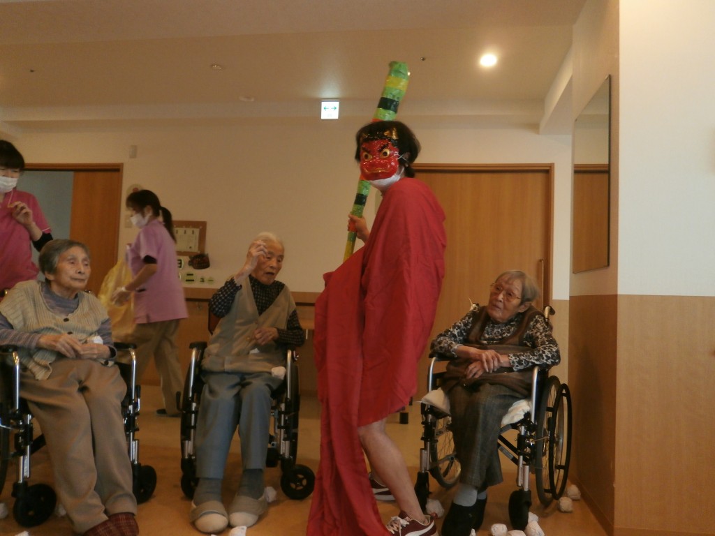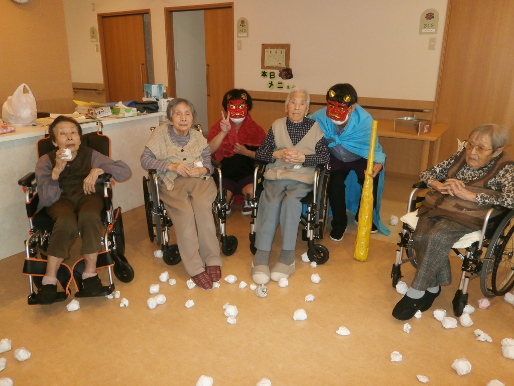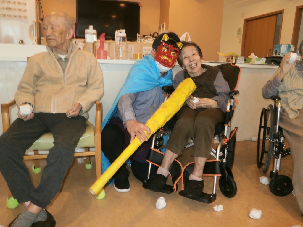 赤鬼と青鬼が入居者の皆さんの前に現れ、豆替わりに丸めた紙を鬼たちにぶつけています。
