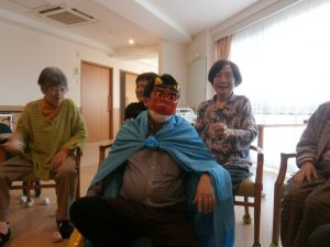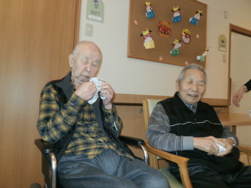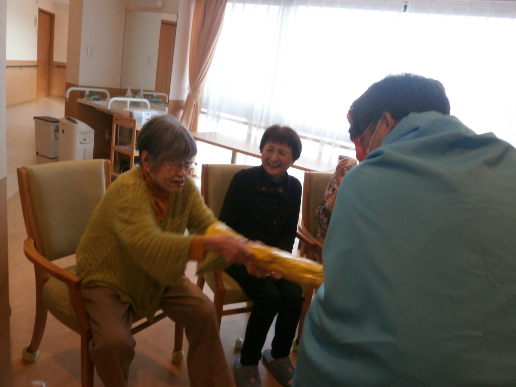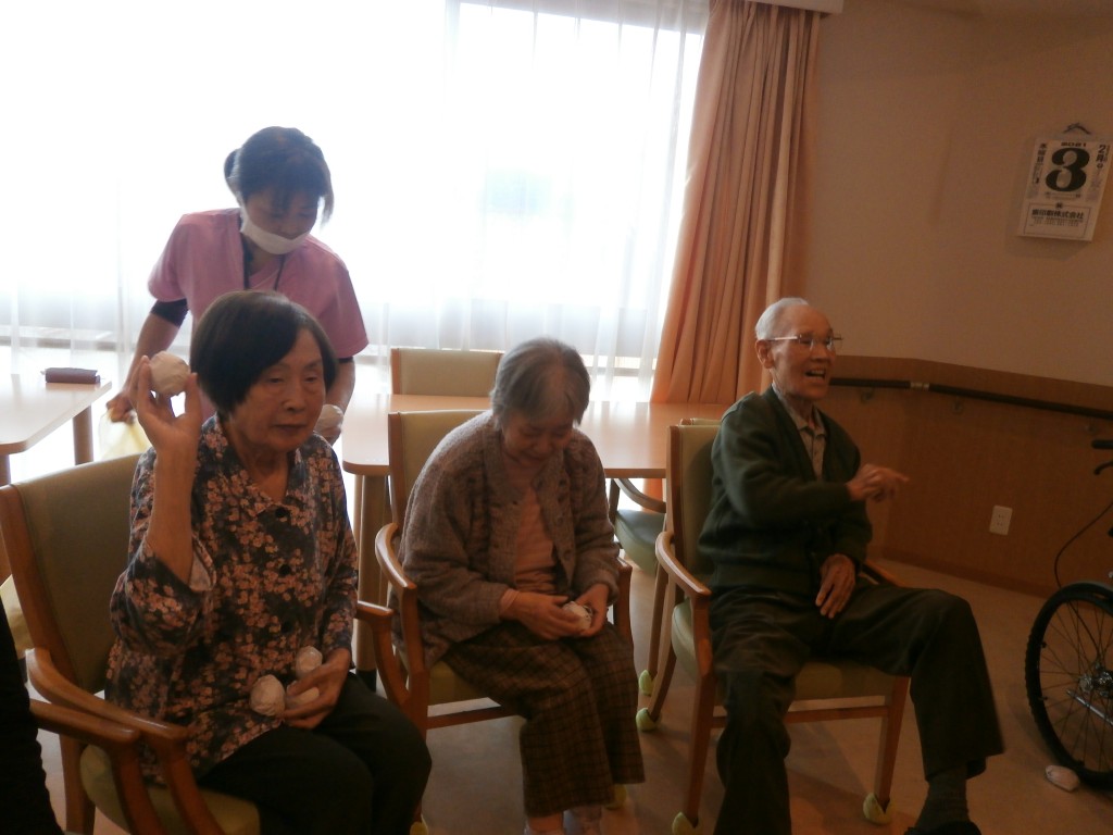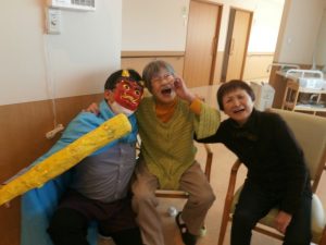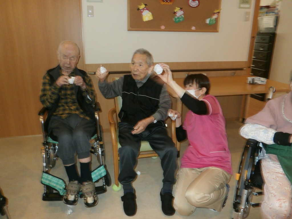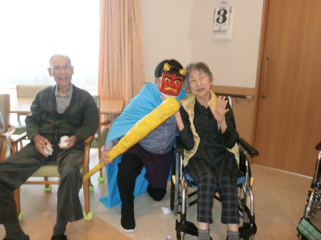赤鬼と青鬼が入居者の皆さんの前に現れ、豆替わりに丸めた紙を鬼たちにぶつけています。