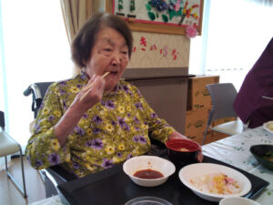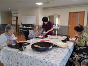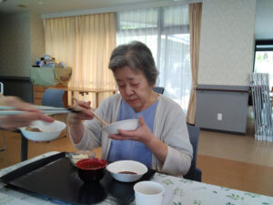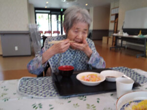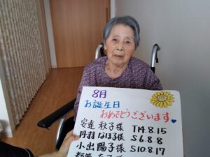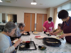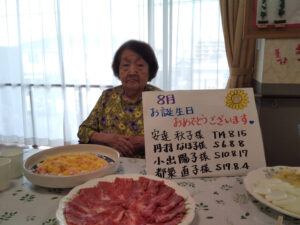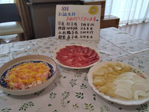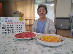 8月の誕生日会を行いました。誕生日の方には1階多目的ホールで焼肉とちらし寿司を召し上がっていただきました。
