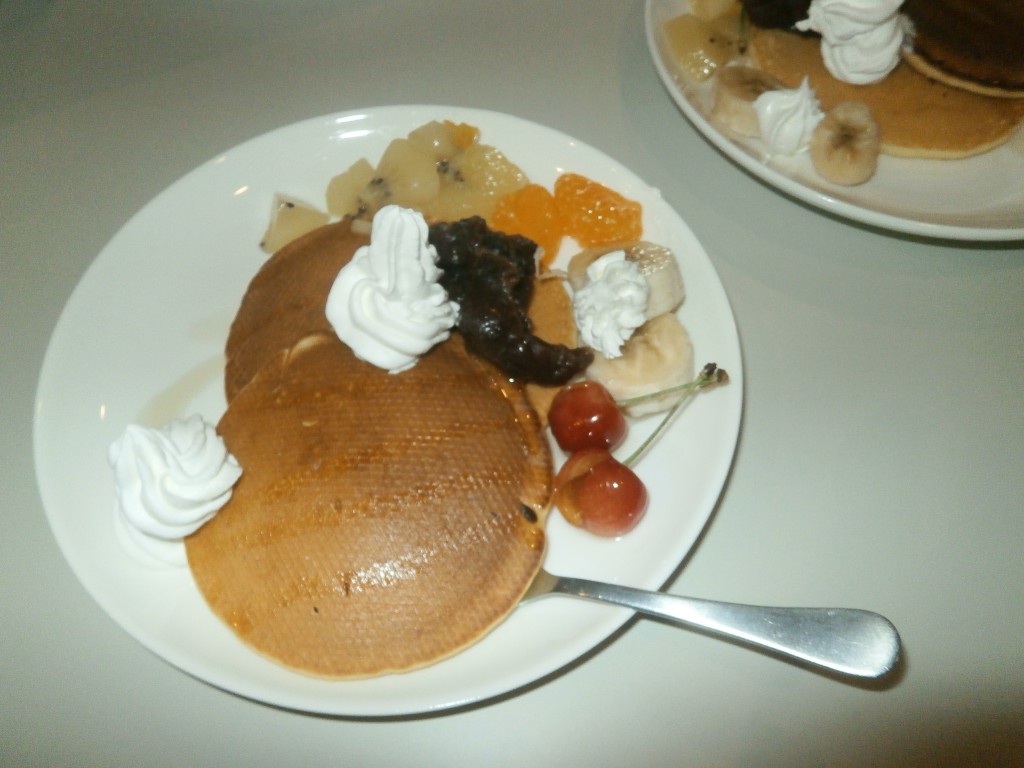 ホットケーキとフルーツの盛り合わせがおいしそうです。